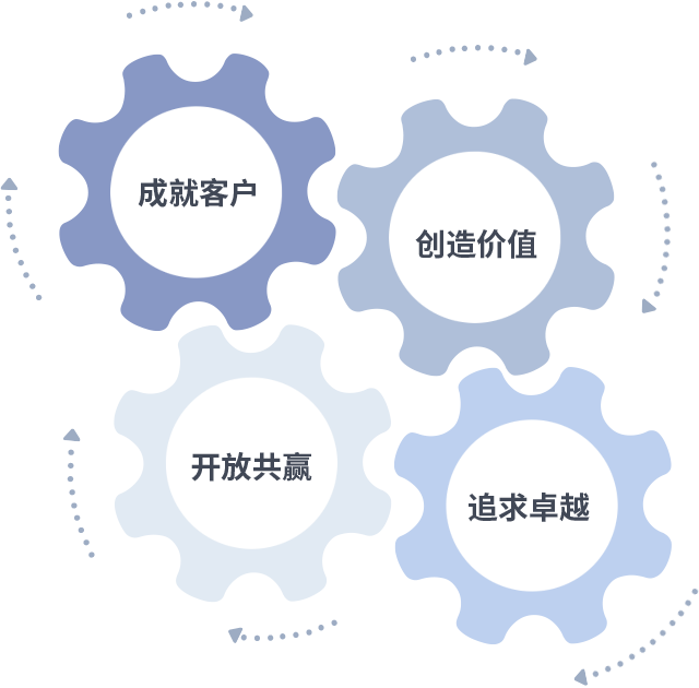 成就客户是一切决策的出发点,,,,创造价值是衡量所有工作的标准,,追求卓越是我们做事做人的态度,,,,开放共赢是我们的格局也是最终的结果。。。。价值观的齿轮环环相扣,,,,推动着组织里的每个人不断向前。。。。